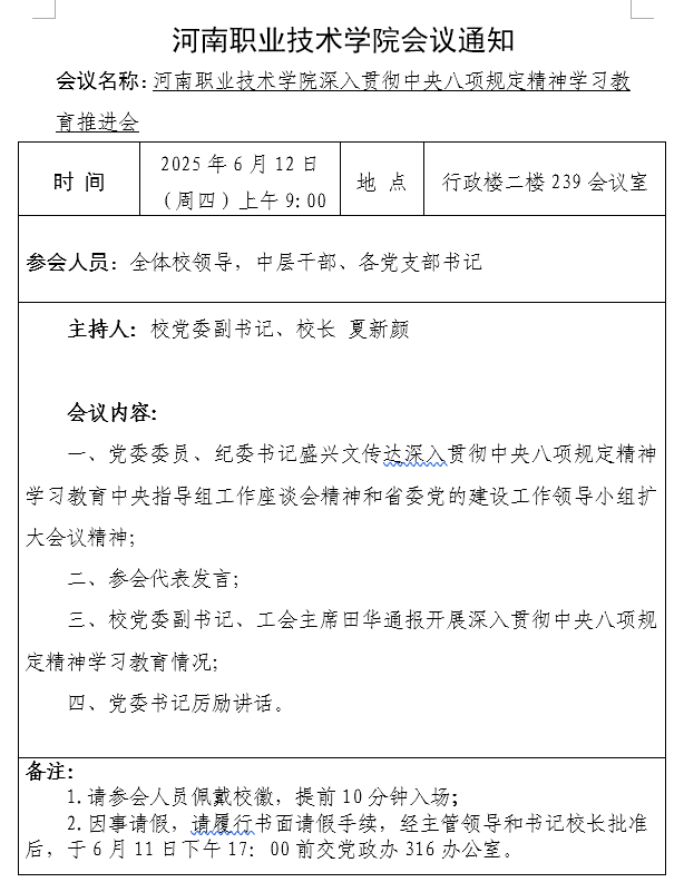 河南职业技术学院深入贯彻中央八项规定精神学习教育推进会通知