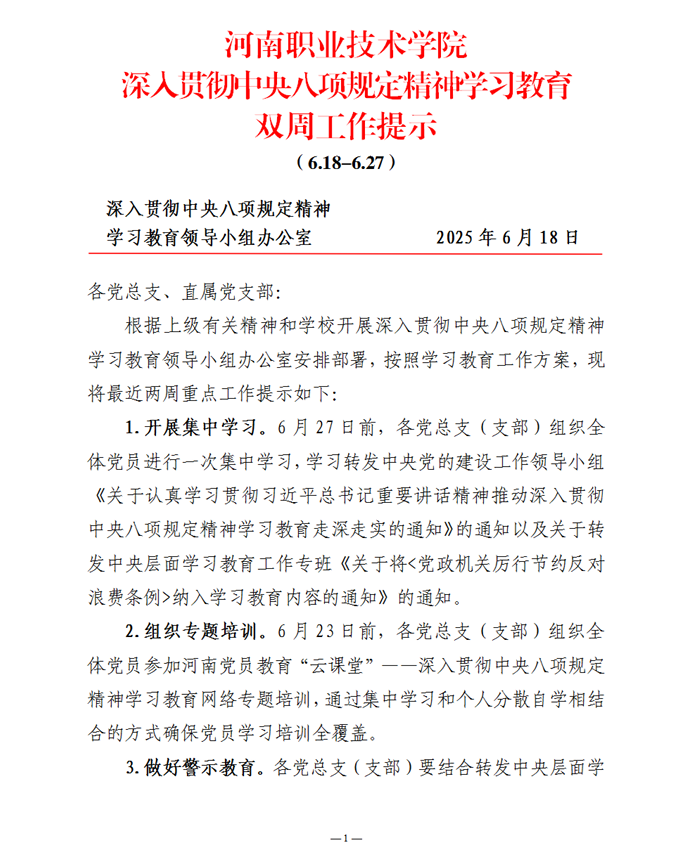 河南职业技术学院深入贯彻中央八项规定精神学习教育双周工作提示