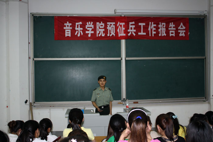 6月9日下午,音乐学院邀请河南省军区宣传处二级士官徐凯,在学院电教楼101教室举行了2011年音乐学院预征兵工作报告会。报告会由音乐学院副院长雷红薇主持,该院200多名学生参加。