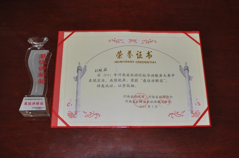 5月27日,“中原福塔杯”河南省旅游院校第一届服务技能(导游服务)大赛在郑州落下帷幕。旅游烹饪系09级旅游英语专业张慧聪和旅游管理专业时艳喆同学代表学院参加了比赛,经过“现场讲解、专业笔试、才艺展示”三个环节的激烈角逐,两名选手双双获得本次大赛最高奖项一等奖,总成绩名列34支参赛队伍的第一名;时艳喆同学在现场讲解中以其独特精彩的讲解征服了全场的评委及观众,夺得了大赛最高分,并荣获“最佳讲解奖”,充分展示了我院旅游专业的办学水平和人才培养上的实力。由于大赛成绩突出,组委会对我院颁发了“优秀组织奖”。