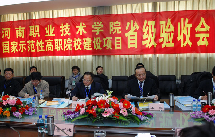 3月14日到15日,河南省教育厅、财政厅组织以上海市教育科学研究院副院长马树超为组长、新疆农业职业技术学院院长王毅为副组长、教育部职业技术教育中心研究所所长助理姜大源、中国机械工业教育发展中心副主任陈东、河南工业职业技术学院院长李生平、黄河水利职业技术学院副院长孙五继、平顶山工业职业技术学院副院长李树伟为成员的7人专家组对我院的国家示范性高等职业院校建设项目进行省级验收。