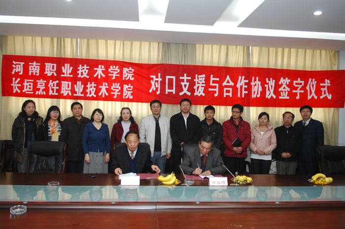 2010年11月5日,长垣烹饪职业技术学院院长梁益海一行四人来我院考察交流并签订对口支援与合作协议。院长王爱群同志、副院长彭志宏同志出席了签字仪式。会议由组织人事处周刚处长主持,两办、教务处、继续教育学院、餐旅系、示范办的负责同志参加了座谈。