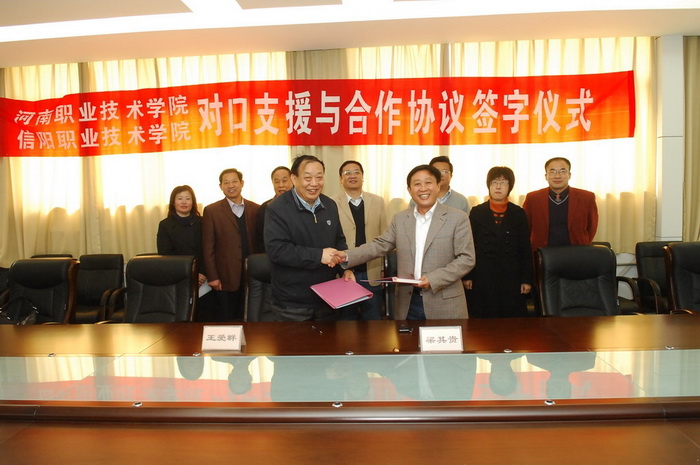 2010年4月15日下午,我院与信阳职业技术学院对口支援与合作协议签字仪式在学院隆重举行。信阳职业技术学院领导和我院领导一同出席了签字仪式。
