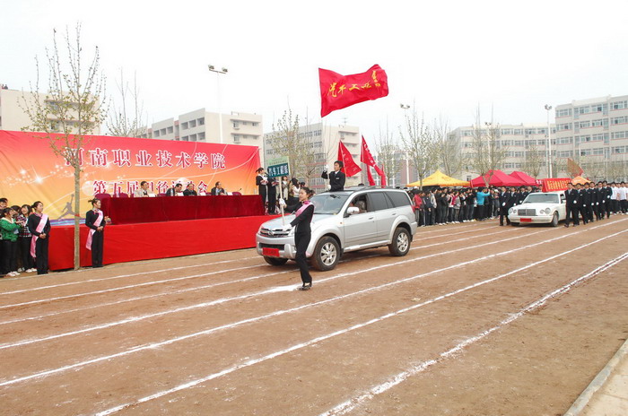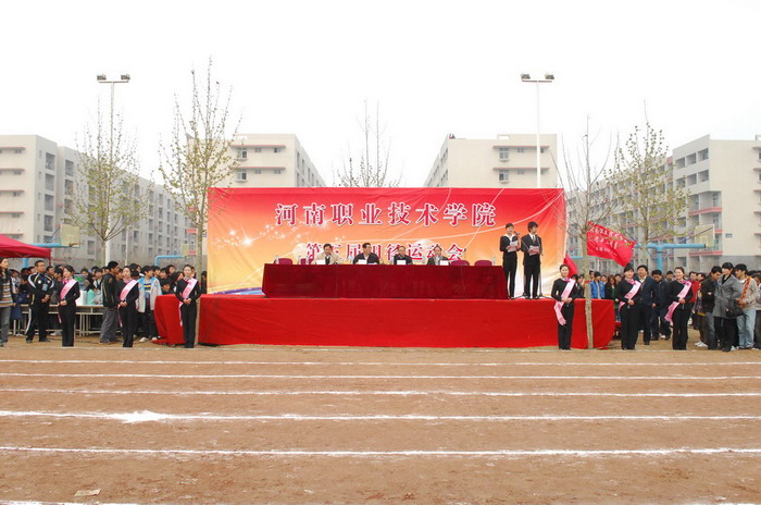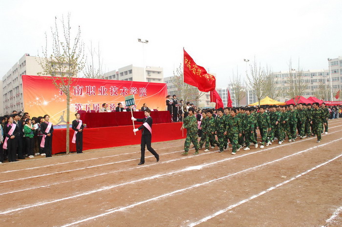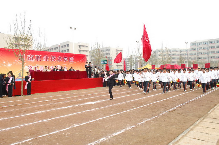 庄严嘹亮的国歌声后,院党委书记杨寿亭宣布河南职业技术学院第五届田径运动会开幕。开幕仪式上,院长王爱群同志作了热情洋溢的开幕致辞。他说,学院树立“一切为了学生,为了学生的一切”服务理念,以示范高职建设为重点,加强学院内涵建设,在教学、科研、管理等各个方面,取得了显著成绩,现已成为全国高校毕业生就业工作五十强候选单位。体育教育是学院教学工作的重要组成部分,伴随着学院办学层次的提升,我院体育运动有了较快的发展。广大师生积极投身于形式多样的体育运动,不仅丰富了校园文化生活,也为学院各项事业的发展注入了生机和活力。本届运动会不仅是对我院体育运动的检阅,也是全院学生精神面貌的展示。他预祝本届运动会圆满成功。随后,运动员代表和裁判员代表分别作了宣誓发言。