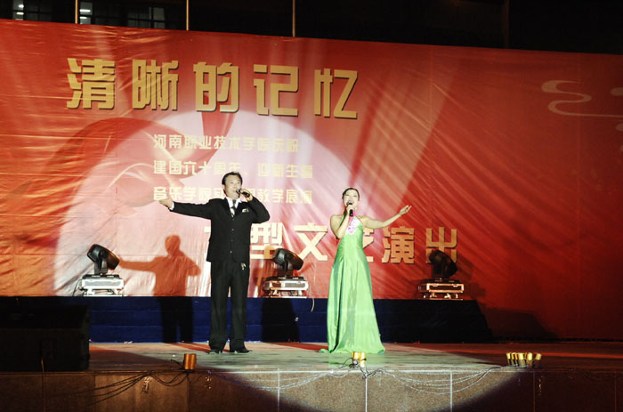 为庆祝建国60周年,活跃校园文化生活。9月28日晚,我院举行了以“清晰的记忆”为主题的庆祝建国60周年文艺演出。省人力资源和社会保障厅机关党委专职副书记白杨林、院党委书记杨寿亭、院长王爱群、副院长彭志宏和苏斌、工会主席郭自川等出席,与教学系部和行政部门负责人及万余名师生一同观看了演出。