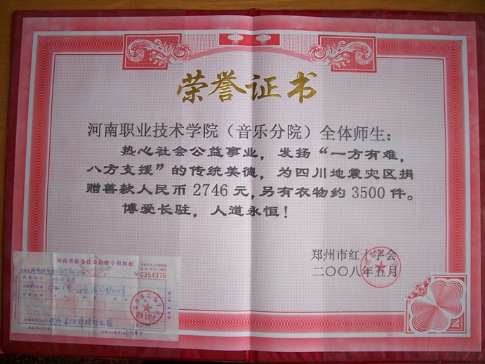 5月15日,在音乐分院团总支王达亮书记倡议下,分院在学生中组织了“国家有难你我有责、奉献爱心师生同行”的募捐活动。此次活动,共募得现金2746元,捐献衣物等3500件。这些钱物已于15日晚送往郑州市红十字会。