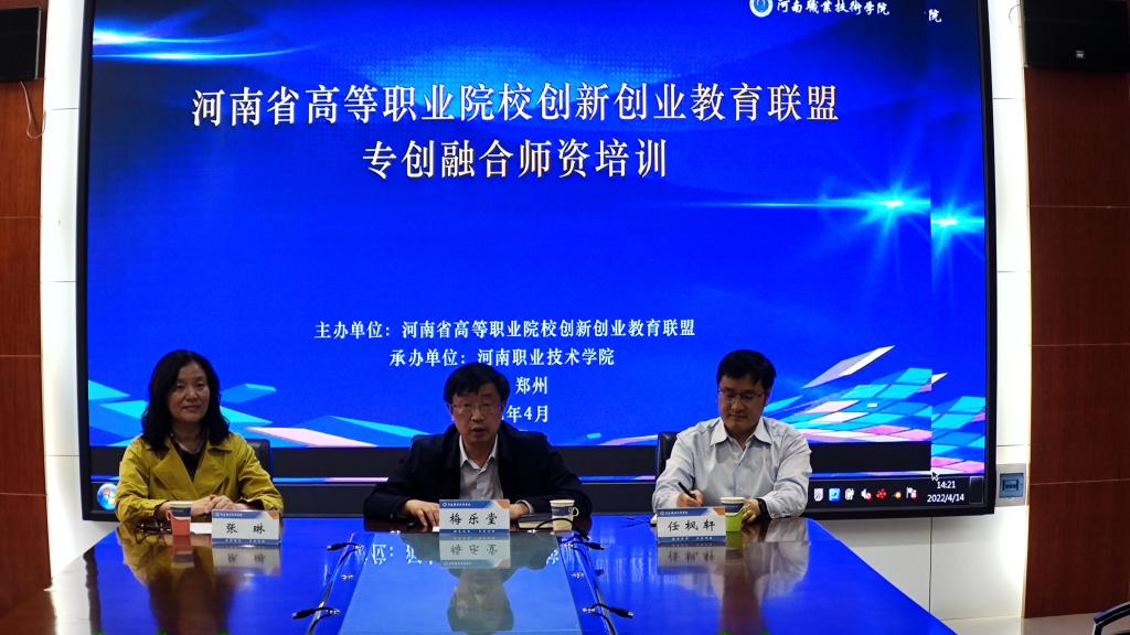 4月14日下午,河南省高等职业院校创新创业教育联盟专创融合师资线上培训会在河南职院召开。河南职院作为联盟理事长单位参会,校长梅乐堂出席培训会并致辞,副校长任枫轩出席培训会。共有来自省内40余所联盟院校的2000余名教师线上参加了培训。