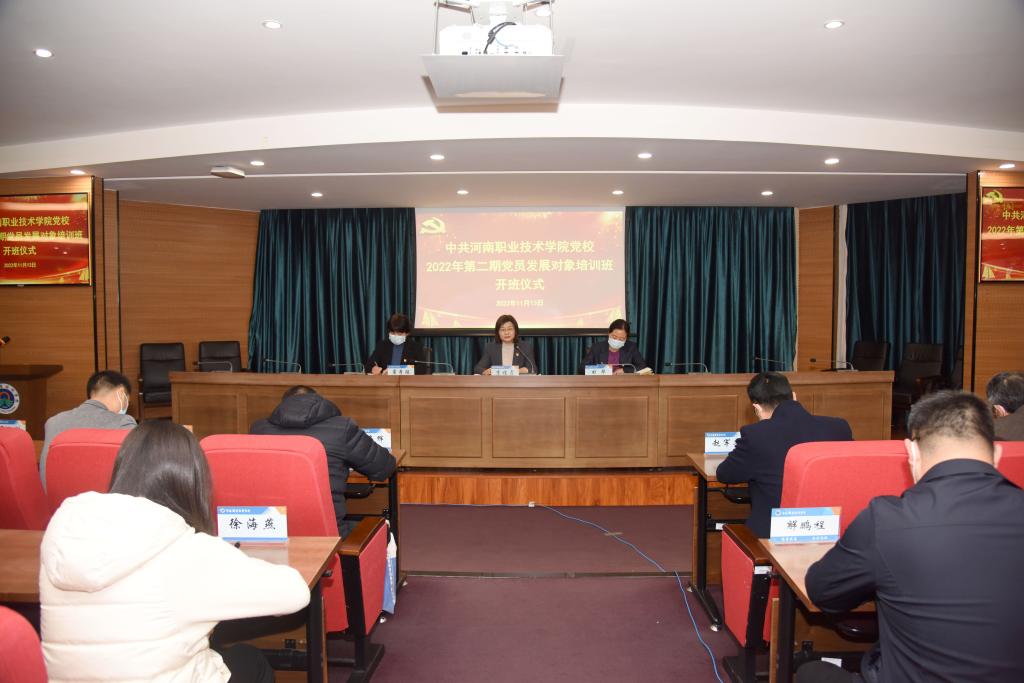 11月13日上午,河南职院2022年第二期党员发展对象培训班在行政楼238会议室开班。校党委书记李桂贞出席开班仪式并讲了题为《永远跟党走,奋进新征程》专题党课,党委副书记、纪委书记田华主持开班仪式。各二级学院党总支书记,组织部全体工作人员及158名党员发展对象以线上线下相结合的形式参加。