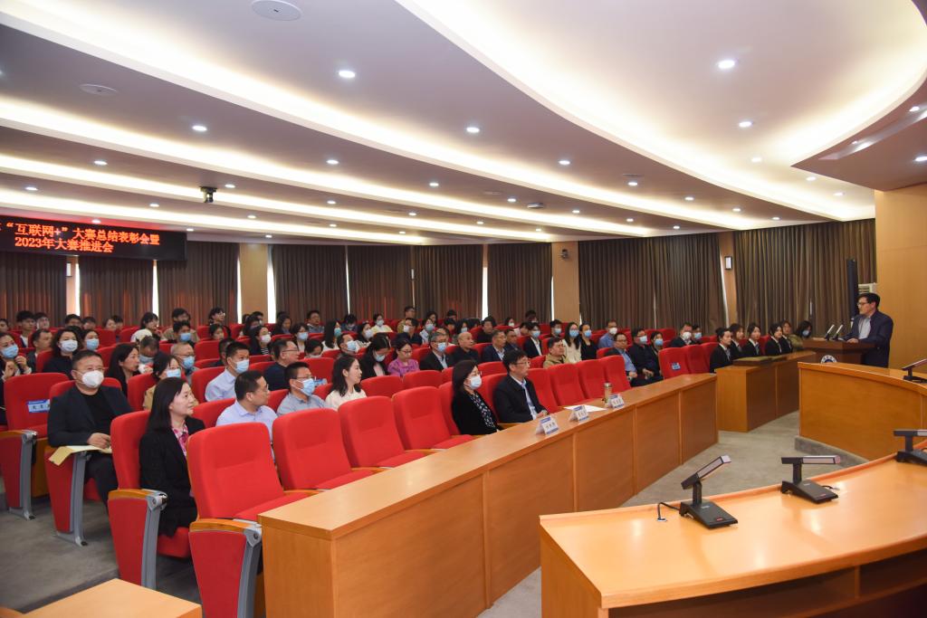 会议现场,播放了学校2022年“互联网+”大学生创新创业大赛成果宣传片;任枫轩宣读了学校2022年“互联网+”大学生创新创业大赛表彰文件;李桂贞分别为获得第八届中国国际“互联网+”大学生创新创业大赛校赛优秀组织奖和获得2022年“青年红色筑梦之旅”活动优秀组织奖的二级学院颁发奖牌。