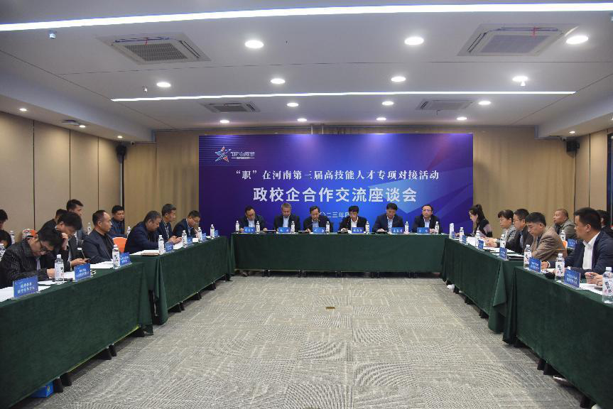 高技能人才对接交流座谈会上,校长梅乐堂和代勇、赵杰、崔秀池、夏喜利,同郑州、开封、洛阳和平顶山等14个地市公共就业服务机构及13家用人单位进行座谈。梅乐堂希望,校、政、企三方深化交流与合作,共同搭建人才互动、资源互通的交流对接平台,培育更多适应我省现代产业体系发展的高素质复合型、实践型、创新型技术技能人才,积极助力毕业生充分就业、企业创新发展和河南经济建设。会上,学校还与参会的公共就业服务机构和就业单位分别签订了相应的人才供需对接合作协议。