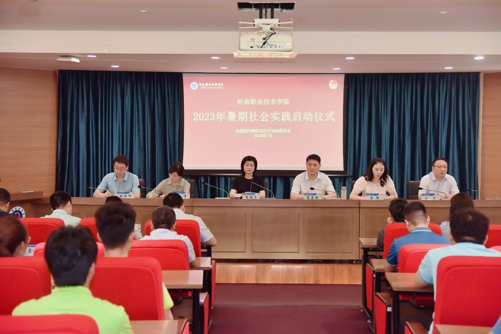 7月5日上午,河南职院在行政楼举办2023年暑期社会实践启动仪式。校党委书记李桂贞出席启动仪式并为实践团队授旗,工会主席夏喜利作动员讲话,宣传部、学工部、招生就业处和各二级学院相关负责人及140余名社会实践团队师生代表参会。