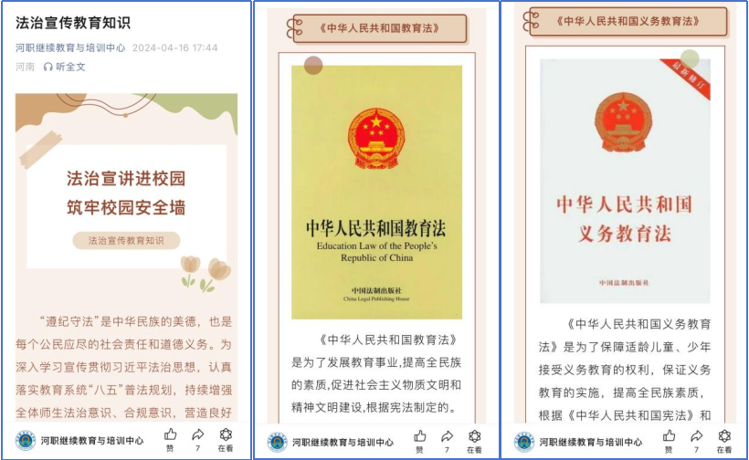 学校各部门、各二级学院也纷纷开展了学习研讨、绘制海报、主题班会等形式多样的法治教育宣传活动,并围绕宪法、国家安全、预防青少年犯罪等相关主题,通过学校网站、微信公众号等平台推送法律知识,引导全校师生将“学法、知法、守法”内化于心,外化于行。