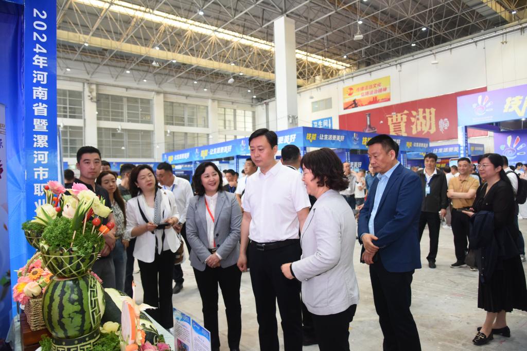 启动仪式后,张国强一行到河南职院展区参观指导,并与学校师生进行交流。学校通过展板牌、多媒体等形式全面展示学校办学特色和发展成果,通过实物模型、现场互动等形式展示我校在人工智能、家具设计、插花艺术、食品雕塑等方面取得的最新成果和获奖作品,得到与会领导和嘉宾的广泛关注和一致好评。