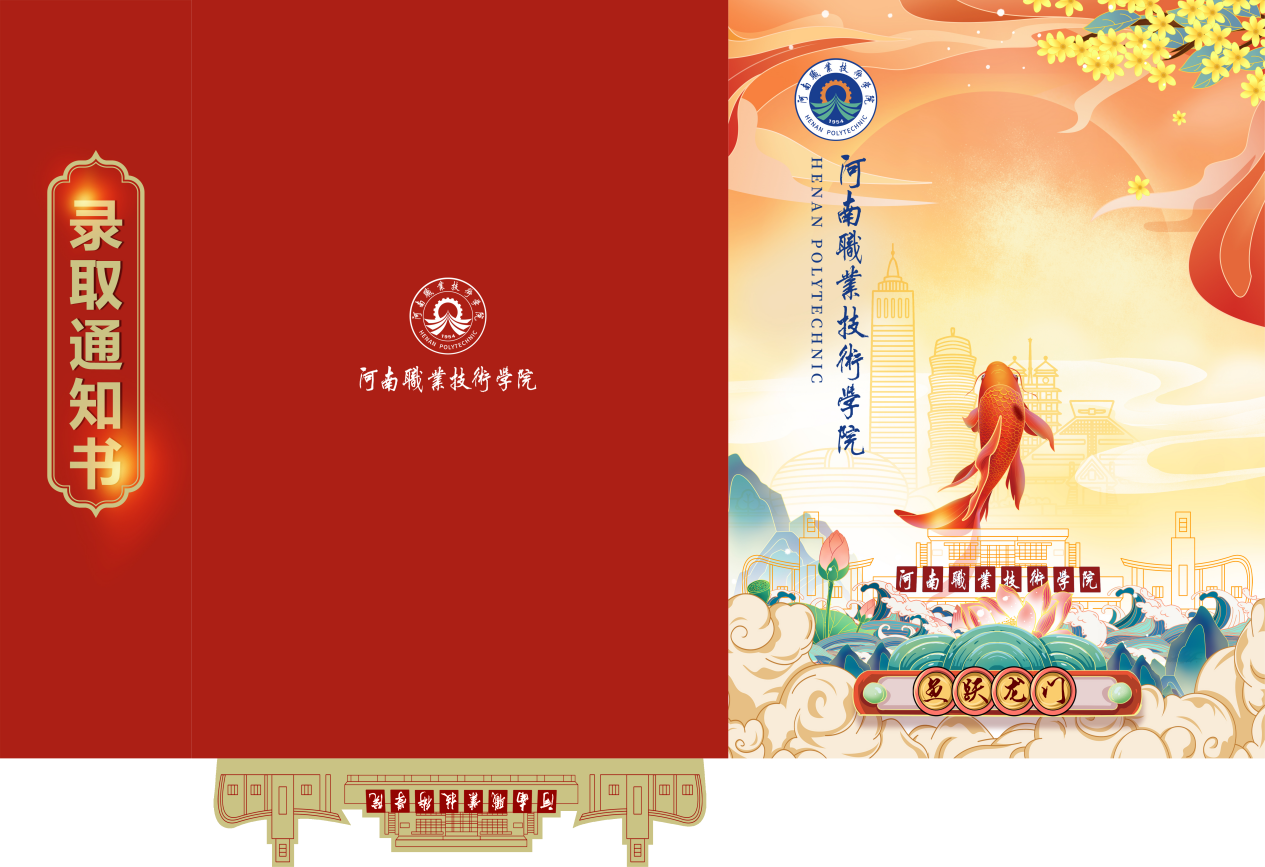学校2024年的录取通知书在设计上别出心裁,由数字创意与设计学院赵永立、朱函兵和王兆阳三位老师共同设计,整体风格典雅而庄重。通知书封面以喜庆的红色为主色调,融入国潮风,搭配温馨又不失庄重的玫瑰金色,营造出一种既正式又充满活力的氛围。设计上巧妙融合了校徽与标志性建筑——校门的线条图案,象征着学子们即将跃过“龙门”,成为河职大家庭的一员,寓意深远且富有激励性。
