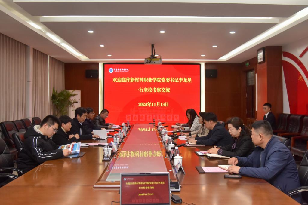 11月13日下午,焦作新材料职业学院党委书记李龙星一行5人来校就校企合作、产教融合情况进行考察交流,校党委副书记、校长夏新颜出席座谈会。发展规划处、教务处等部门负责人参加座谈会。