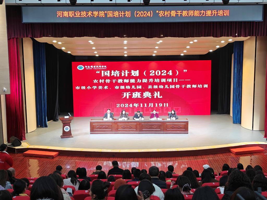 11月19日上午,“国培计划(2024)”市级小学美术、幼儿园及县级幼儿园骨干教师培训班在河南职院开班。河南省“国培计划”基础教育项目办主任孟玉红教授,校党委委员、副校长李玉峰出席开班典礼。学校数字创意与设计学院、音乐学院、继续教育学院负责人及18个地市的300名骨干教师参加开班典礼。