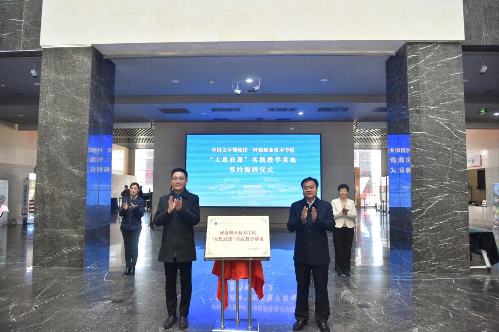 11月28日上午,河南职院与中国文字博物馆举行“大思政课”实践教学基地签约揭牌仪式。校党委书记厉励,中国文字博物馆党委书记、常务副馆长宁红亮出席仪式,并共同为学校“大思政课”实践教学基地揭牌。校党委副书记、工会主席田华,党委委员、组织部部长杨华;中国文字博物馆党委副书记、副馆长、市政府参事李宽生,党委委员、副馆长魏文萃等出席仪式。