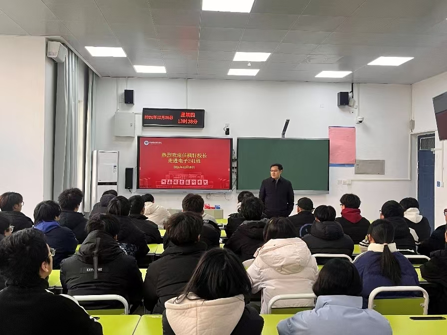 12月26日下午,校党委委员、副校长任枫轩以“当前国际形势下大学生的应然和实然”为题,先后为电子与物联网学院电子专业2024级学生和数字创意与设计学院数字媒体技术专业2024级学生讲授思政课,并进行座谈交流。