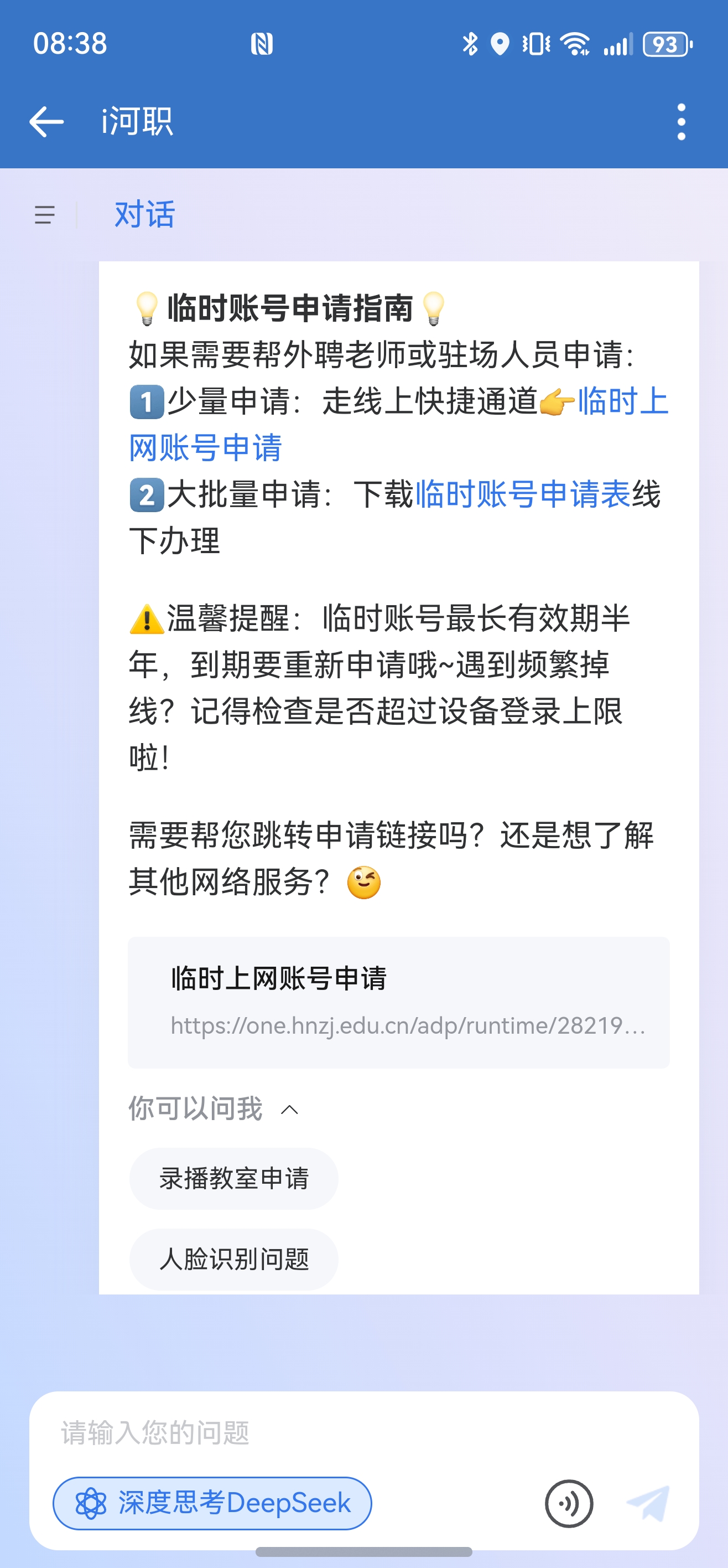 “i河职”依托DeepSeek、通义千问等大语言模型的语义理解与逻辑推理能力,深度整合学校网站数据,融合校内知识库资源,实现了7×24小时智能应答。“i河职”可针对学校规章制度解析、生活服务指南、人脸识别问题,实现一键获取。同时,在教学方面,教师可通过“i河职”生成教案模板、设计课堂互动环节,提升备课效率;学生可通过“i河职”解析学科知识点,获取个性化学习计划建议,真正实现“有问必答,答即所需”。
