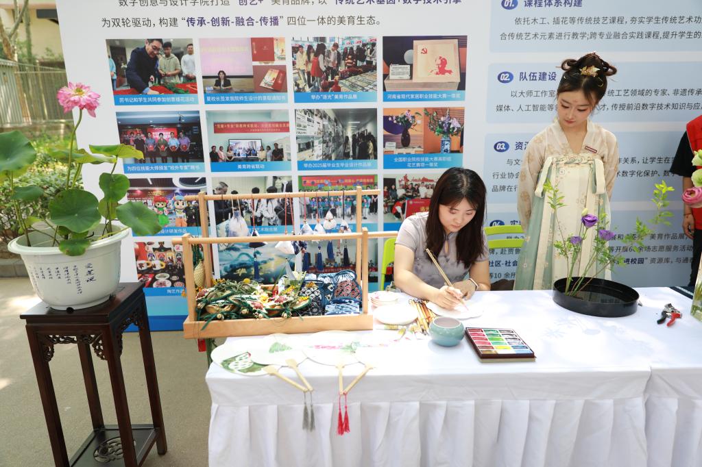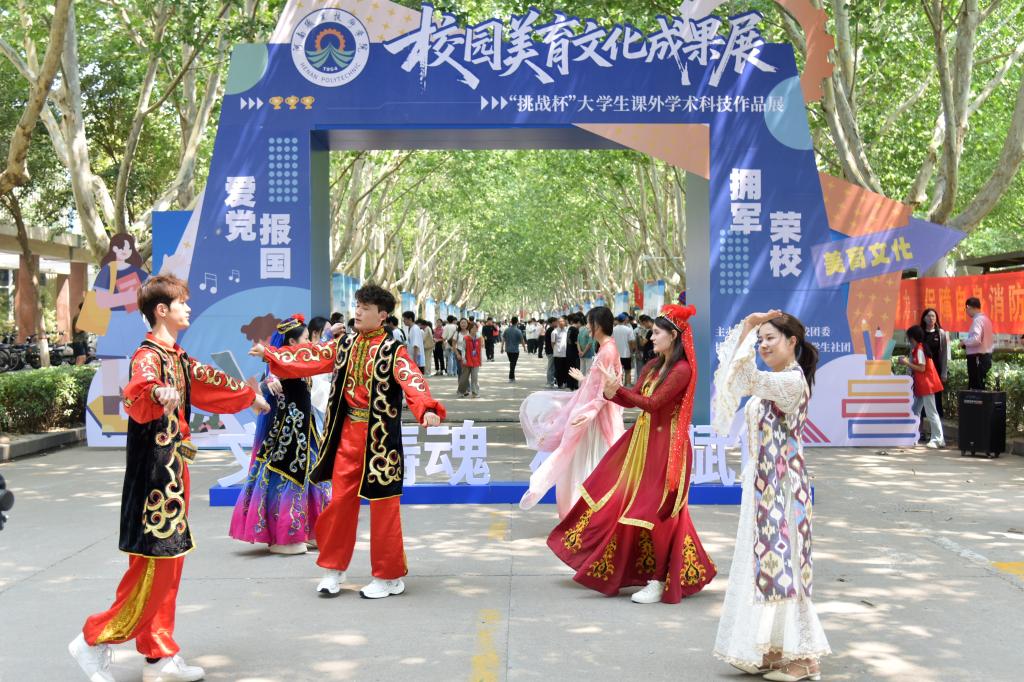 本次活动分为美育文化、挑战杯作品、社团风采等三大成果展区,全方位展示了学校美育文化、科技创新和社团活动的丰硕成果。在美育文化展区,12个二级学院立足自身实际,将美育文化与专业特色深度融合,展示了科技创新、创意手工等作品,彰显了专业建设与美育浸润成果;在第十七届“挑战杯”河南省大学生课外学术科技作品展区,19个决赛入围项目精彩呈现、百花齐放,展现了学校科技赋能成效和学生们勇于创新、敢于实践的精神风貌;在社团风采展区,20个学生社团各展其长,通过音乐舞蹈、舞狮表演、创意烹饪、互动游戏等多种形式,展示了学生们丰富多彩的兴趣爱好和青春洋溢的校园文化生活。