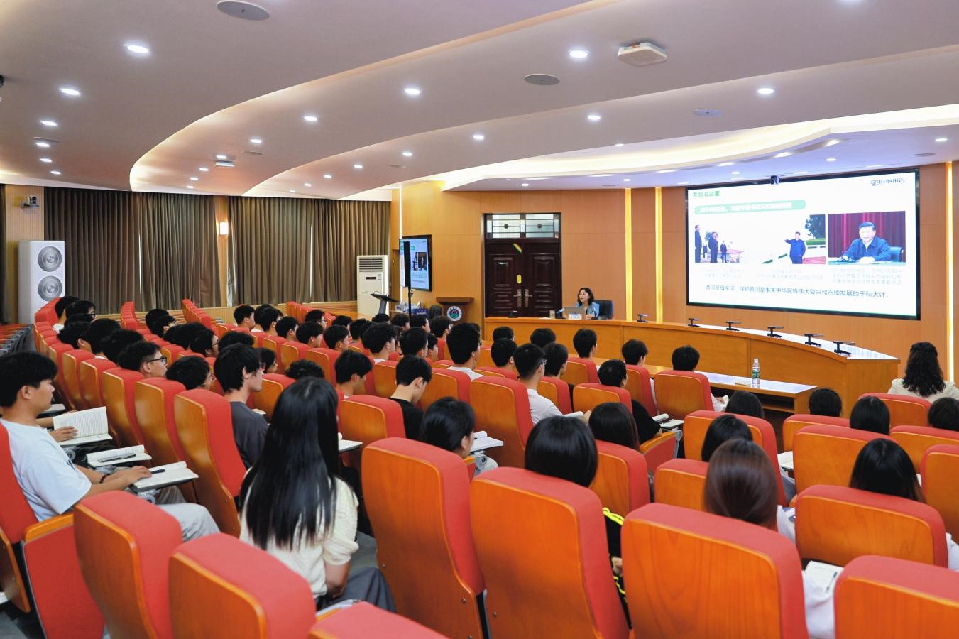 课堂上,夏新颜从“为什么要建设美丽中国、美丽中国建设的现状如何、青年学生如何为美丽中国建设作出积极贡献”三个方面,深刻剖析了全面绿色转型的重大意义、美丽中国建设取得的成绩和面临的挑战、美丽中国建设的青春担当。夏新颜强调,全面绿色转型是新时代党治国理政新理念新实践的重要标志,是实现高质量发展的关键环节,是解决我国资源环境生态问题的基础之策,是建设人与自然和谐共生的现代化的内在要求。我国要摒弃以牺牲环境换取一时发展的短视做法,深入贯彻新发展理念,主动顺应全球绿色发展大势和新一轮科技革命,积极推进产业结构转型升级,大力发展绿色低碳产业,提升经济社会发展质量效益,在经济发展中促进绿色转型,在绿色转型中实现更大发展。