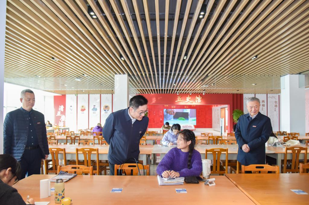 调研中,厉励先后前往图书馆二楼、三楼深度学习区、复习考试专区、总服务台、智能设备区、期刊阅览专区,以及四楼五楼办公区,实地察看馆藏布局、借阅流通数据、电子资源利用率、设施运行保障、消防安全等情况。在总服务台,厉励认真翻阅读者意见簿,详细了解读者服务开展情况,对图书馆及时反馈、妥善解决师生提出意见建议的做法予以肯定。在办公区,厉励与在岗职工亲切交流,对图书馆全体人员主动融入“双高计划”建设与职业本科创建大局,为学校人才培养和校园文化建设做出的重要贡献表示衷心的感谢。在自习区,厉励轻步走近同学们身边,轻声与大家交流,仔细询问学习生活情况,勉励他们珍惜图书馆优质的学习资源和良好的学习环境,勤学善思、笃行实干,在知识的海洋中锤炼本领、增长才干,努力成长为堪当强国建设、民族复兴大任的栋梁之材。