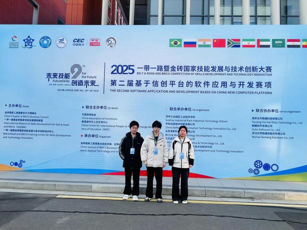 近日,2025一带一路暨金砖国家技能发展与技术创新大赛--第二届基于信创平台的软件应用与开发赛项总决赛在苏州举行,学校现代信息技术学院学生代表学校参赛,经过激烈角逐,获一等奖1项、二等奖1项、优秀奖1项,学校荣获“最佳组织奖”。