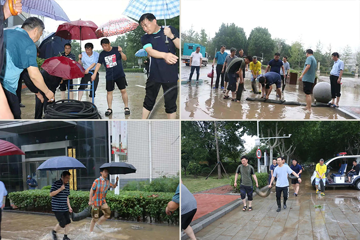 险情就是命令,校园就是战场。面对险情,学校党委书记李桂贞和院长梅乐堂等其他领导班子成员第一时间赶到现场,冒着大雨亲自参与并组织相关人员排涝抢险。党政办联系应急、防汛等部门询求援助并进行综合指导协调;后勤管理处组织专业人员安装5台水泵进行排涝;保卫处组织安保人员进行校园安全排查巡逻,对有险情的地方用警示标识;基本建设处组织人员在校内在建工地灌装防汛沙袋并协助做好排水等工作。在学校领导的统一指挥下,以上部门和音乐学院、宣传部、组织部、人事处、团委、学工部、教务处、发展规划处、国有资产管理处和商学院等部门人员共同参与到抢险救灾工作当中。