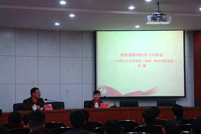 报告会由电影《焦裕禄》中焦裕禄同志大女儿焦守凤扮演者、中原文化艺术学院戏剧系副主任芦珊教授主讲。随着一段25年前《焦裕禄》电影中家人和群众为焦裕禄同志下葬时的片段的播放,报告会拉开帷幕。芦教授分别从一位演员、导演和共产党员三个不同角色与入会人员分享了学习焦裕禄精神的体会。作为一名演员,她深受焦裕禄“敢教日月换青天”的精神影响,并把“踏踏实实做人、认认真真做事”作为自己的座右铭。作为一名导演,她认为虽然时代变了,市场经济下唯利是图的不良现象丛生,但是当年焦裕禄精神的魅力依然发挥作用,艰苦奋斗的作风仍然有必要,焦裕禄精神永远不会过时。作为一名共产党员,她把四川凉山山村教师、最美女校长李灵和广大恪职尽守的教职员工,以及史来贺、吴金印、程相文、杨善洲等作为榜样,立足本职岗位,扎扎扎实实工作,始终牢记党的宗旨,始终心中装着百姓,始终践行群众路线,共同以焦裕禄为榜样,彼此为人人的榜样,实现人生的价值。