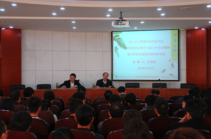 3月20日下午,学院党委书记王长钦为学院领导干部和师生党员代表共160人,作了题为《深入学习贯彻习近平总书记一系列重要讲话和十八届三中全会精神,推动学院各项事业取得新发展》的党课辅导报告。辅导报告会由彭志宏副院长主持。