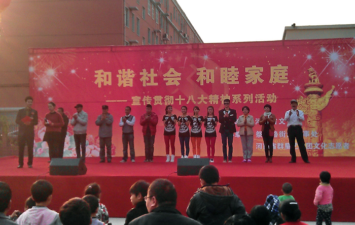 11月18日下午,“和谐社会,和睦家庭——宣传贯彻十八大精神系列活动”在祭城路街道办事处举行。音乐学院院长雷红薇、副院长刘岩和艺术实践部主任吴建华的带领我院“群星艺术团”5名志愿者参加活动进行社会服务演出。