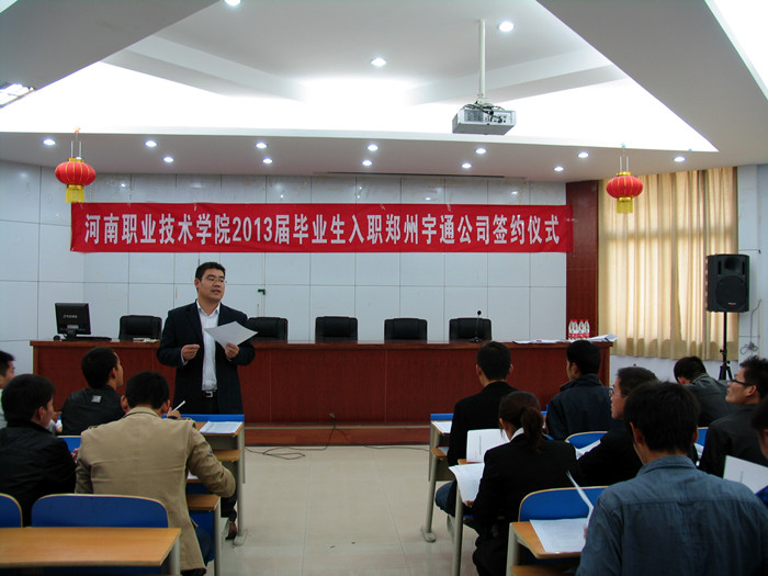 10月31日下午,郑州宇通客车股份有限公司招聘签约仪式在行政楼B208举行,我院77名2013届毕业生成功选聘入职,成为我院2013届首批成功就业的毕业生。
