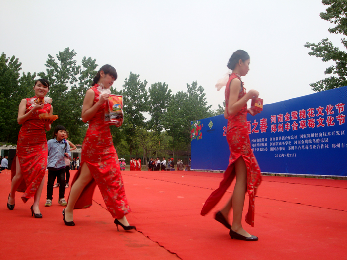 4月21日上午,在旅游管理系党总支书记王延东和敬璐老师的带领下,该系酒店管理专业6名学生应邀参加在郑州鸵鸟园举行的2012年金鹭槐花草莓文化节开幕式,担任礼仪服务工作。