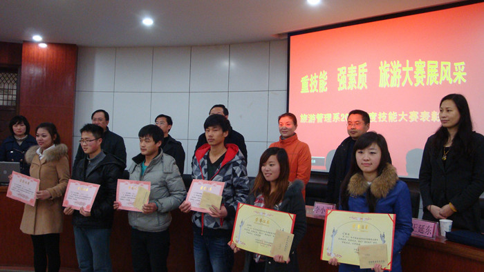 3月22日下午,旅游管理系在行政楼圆形会议室召开了2011年度旅游技能大赛表彰大会。副院长彭志宏、教务处处长周宗杰、招就处处长张琳、合作办学处副处长李小强出席会议。该系全体教师、获奖选手及100余名学生代表参加了会议。会议由该系副主任李岚主持。