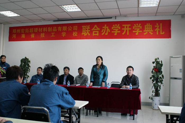 11月22日下午,我院附属技校与郑州宏拓超硬材料制品有限公司的联合办学开班仪式在郑州宏拓隆重举行。副院长肖珑、附属技校党总支书记赵文涛、副校长刘蕤,郑州宏拓总经理孙晓伟和副总经理王林山,以及全体学员参加了开班仪式。