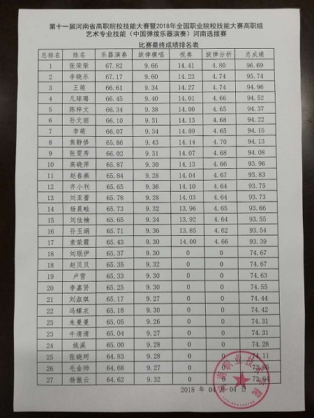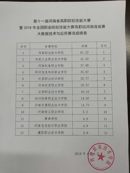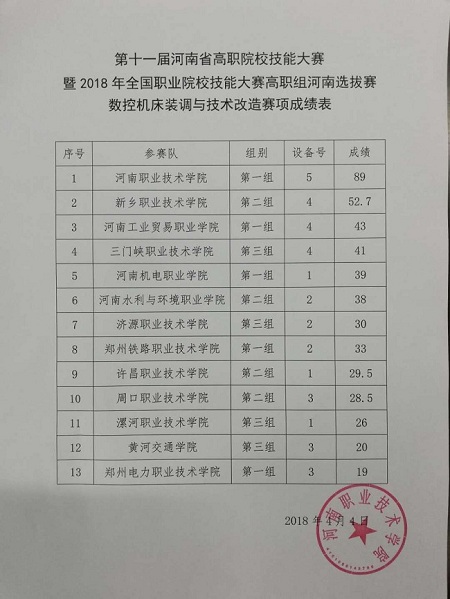 2018年全国职业院校技能大赛高职组河南省选拔赛数控机床装调与技术改造、大数据技术与应用、艺术专业技能(弹拨乐器演奏)三个赛项于2018年4月2日—4日在我校举行,现就三个赛项比赛成绩进行公示,公示期4月4日—4月6日。