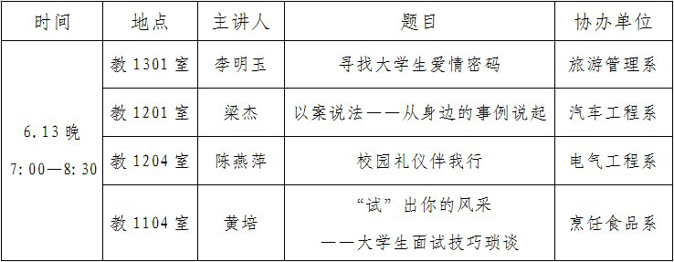 现将6月13日(周四)晚由旅游管理系、电气工程系、汽车工程系和烹饪食品系协办的学院2013年人文大讲堂安排如下(见附表)。届时欢迎各位领导及广大师生前去听讲。