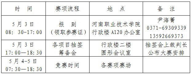根据教办高〔2013〕54号文件精神,河南职业技术学院为工业产品造型设计与快速成型、数控机床装配、调试与维修、注塑模具CAD与主要零部件加工、智能电梯装调与维护等四个竞赛项目的省选拔赛承办单位。请各参赛队于5月3日来校报到,竞赛时间5月4日—5日。现就竞赛赛项规程及具体承办赛项赛程公布如下: