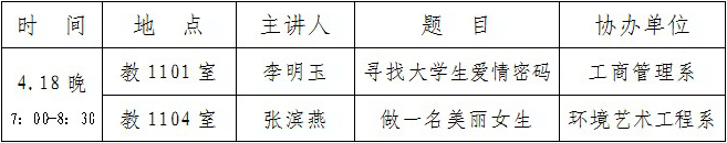 现将本周四晚由工商管理系和环境艺术工程系协办的学院2013年人文大讲堂安排如下(见附表)。届时欢迎各位领导及广大师生前去听讲。