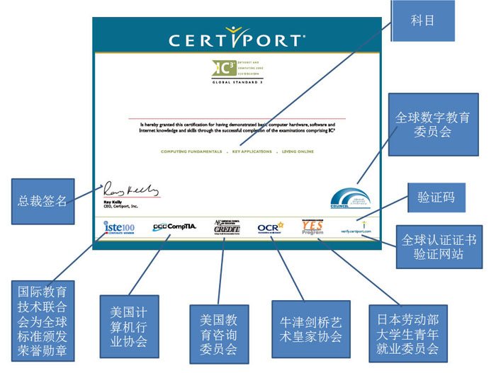6.奖项设置:所有报名参赛选手参加院校选拔赛,均可获得由大赛组委会颁发的参赛荣誉证书。比赛成绩达到国际认证合格线,可申领由Certiport(全球最大IT 国际认证机构)颁发的IC3国际认证证书(见附图)。院校赛前3%的选手晋级参加全国总决赛,总决赛优秀选手晋级参加海峡两岸赛和国际信息化核心技能大赛。