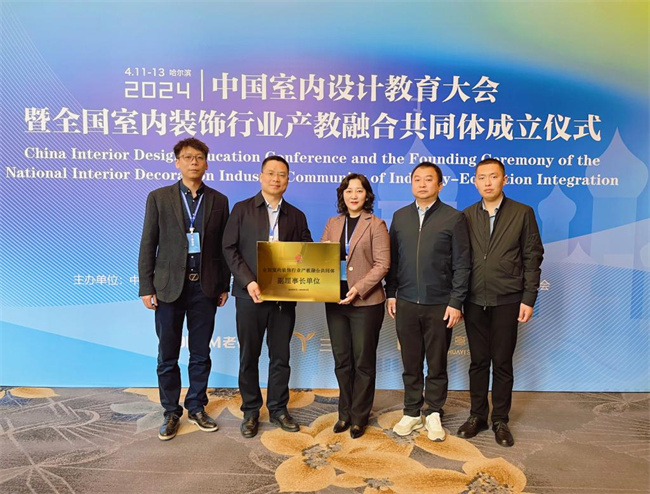 4月13日上午,全国室内装饰行业产教融合共同体成立大会在哈尔滨举行。河南职业技术学院作为副理事长单位应邀参会,校长夏新颜代表学校作了题为《“三对接三提升”,打造产教融合新范式》的职业教育先进经验分享,并受邀为理事单位授牌。党政办、教务处和数字创意与设计学院相关同志陪同。