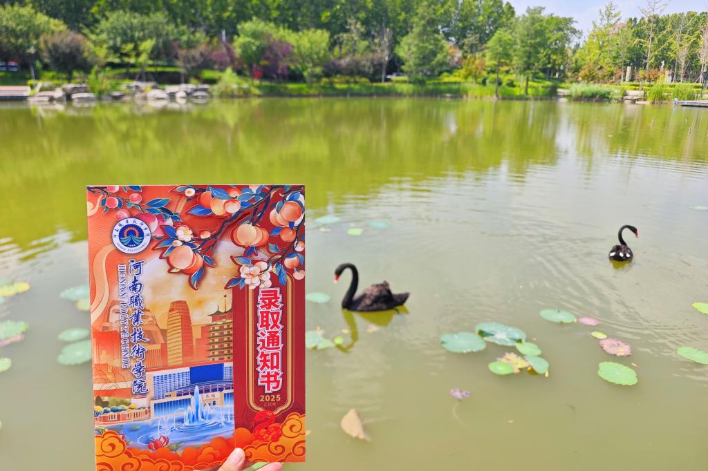打开通知书封套,左侧是学校明湖的明星——黑天鹅的优雅剪影,下方是学校官方微信公众号、官网、抖音平台的二维码,方便新生第一时间了解校园动态。右侧是亲切的问候语“你好,新同学”“桃李满枝”图案和校训“德厚技高,务实创新”。底部呈现学校大门的剪影造型,当内页反折固定通知书时,此剪影恰好展现学校庄重大气的门面形象,象征开启知识殿堂与职业征程。