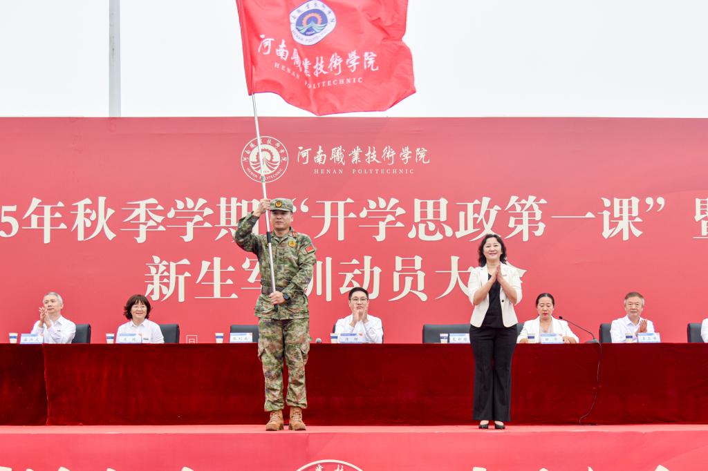 校党委副书记、校长夏新颜为承训单位总教官授校旗;12个二级学院党总支书记为军训教官授院旗,接过旗帜的军训教官神情肃穆、意气风发,展现出昂扬的斗志和坚定的信心。