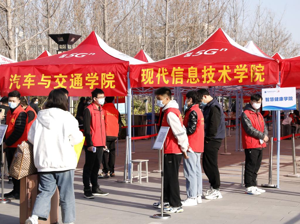 返校现场井然有序,待返校学生在学校南门口经体温检测、行李消杀后进入二级学院通道,经二级学院查验“今日校园”报到二维码、48小时内核酸检测阴性报告、返校行程轨迹登记表后进入校园。