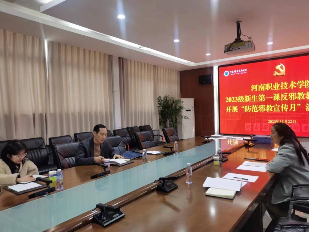 汇报会上,宣传部向专家组详细介绍了学校2023级新生第一课反邪教教育和“防范邪教宣传月”工作开展情况,并围绕领导重视、健全机制、宣传教育、氛围营造、课堂教学等方面向检查组进行了反邪教工作专题汇报。