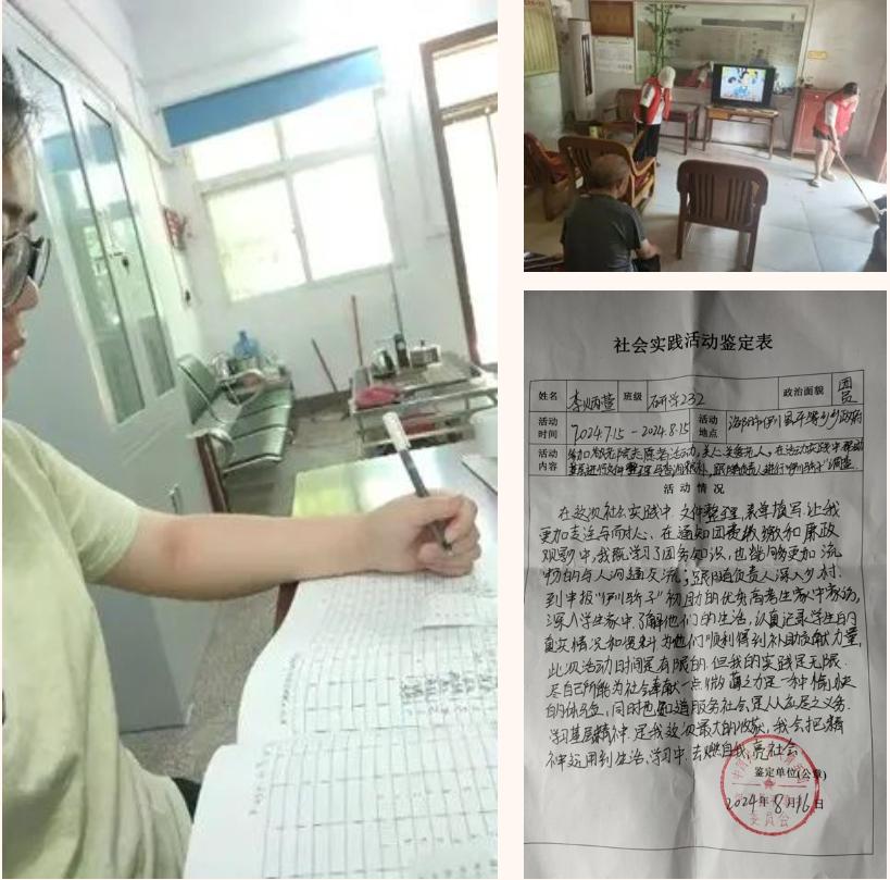 李炳萱,研学232班学生,暑假期间,积极深入基层参与社会实践,在当地农业中心做志愿服务工作,帮助工作人员整理文件,协助村民查询补贴;跟随团队家访优秀高考生,记录家庭情况,助力贫困大学新生申请国家资助;组织村民观看廉政电影,参与团费收缴工作,清洁图文中心;深入敬老院,看望慰问老人;向群众宣传防溺水知识,守护青少年安全。