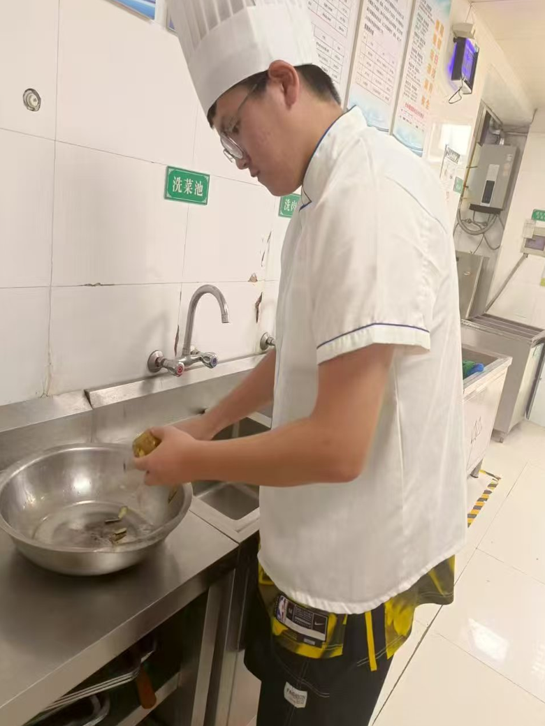 会计(中外)241班学生李展鹏,暑期在餐饮后厨担任帮厨工作。在实践中,他逐渐掌握了洗菜切菜的技巧,了解到不同蔬菜需采用不同的清洗方式,切配菜从最初的形态各异到能切出规整的配菜,清洁油污更需反复擦拭。这些看似简单的操作,都需要专注与耐心。通过实践,他明白无论什么工作都应全力以赴,要尊重劳动、敬畏责任。