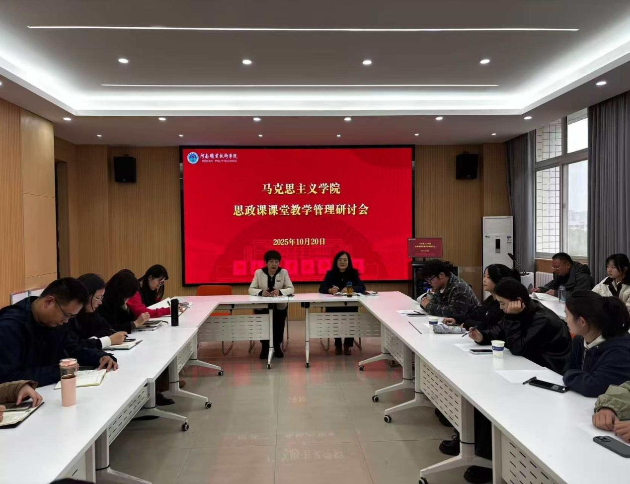 10月20日下午,学校马克思主义学院在勤业楼510室召开思政课课堂教学管理研讨会,积极贯彻落实学校《关于进一步加强学风建设的实施意见》的通知要求,进一步提升思政课的教学质量与育人效果,优化思政课课堂教学管理的路径。副院长胡海涵主持会议,全体思政课教师及学生代表参加会议。
