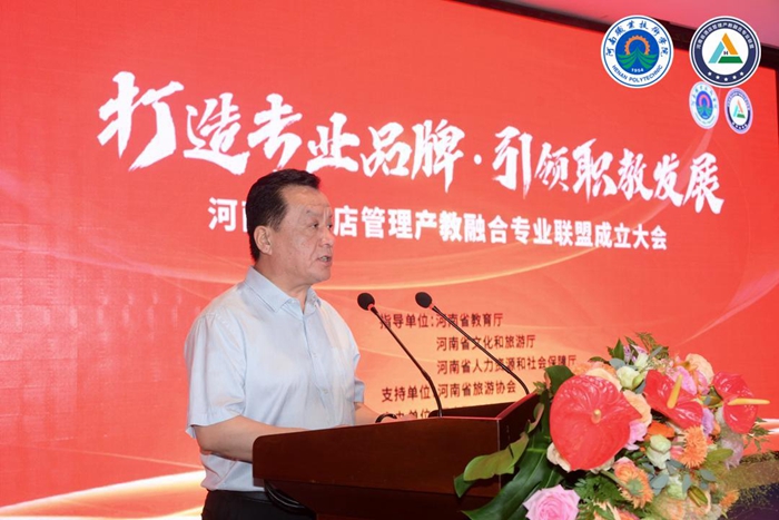 董玉民在致辞中对联盟的成立给予了高度评价,对学校一直以来积极推进产教融合、注重产教协同,强调文化创新,以及在实践中探索出的共建、共享、共赢的校企合作模式给予高度认可。他希望,联盟要发挥好“三个作用”:一是要发挥好联盟的平台作用,利用平台优势提升河南省各高校酒店管理类专业的办学水平和服务经济社会发展的能力;二是要发挥好学校的主导作用,开创资源共享、过程共管、人才共育、责任共担的产教融合、校企合作新局面;三是发挥好企业的主体作用,承担一定的人才培养责任,深度与联盟院校合作,通过产教融合,锻铸企业核心竞争力和品牌影响力。他指出,省教育厅将一如既往地支持高校与行业企业之间的产教融合工作,为打造河南省酒店管理专业教育的新高地做出更大贡献。