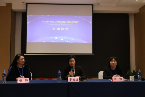 肖珑对参加此次培训的代表们表示欢迎和感谢,并介绍了研修班前期筹备情况和整体安排,再次强调了此次培训的背景和意义,充分肯定了继续教育学院的创新工作精神。李桂贞致辞并作了题为“深入推进专创融合,助力学校‘双高’发展”的开班第一课。她系统介绍了我校双创工作的典型经验、创新创业教育工作取得的成绩及打造双创升级版的思路和想法,她强调下一步我院将推进创新创业教育升级、平台升级、服务升级、扶持升级,全力打造双创升级版。她希望通过此次培训,大家能够互相切磋、交流观念,一起促进创新创业工作再上新台阶,为打造“双创”升级版贡献力量。